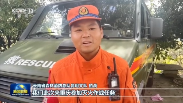 云南省森林消防总队昆明支队 柏战:我们此次来重庆参加灭火作战任务,有很多的第一次,比方说我们第一次坐摩托车上山、第一次在火场上吃到了冰棍,这些都是重庆北碚人民对我们无微不至的后勤保障的一个缩影,感谢北碚人民。