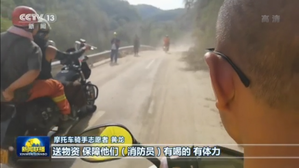 摩托车骑手志愿者 黄龙:送物资,保障消防员有喝的,有体力。尽一下微薄之力。
